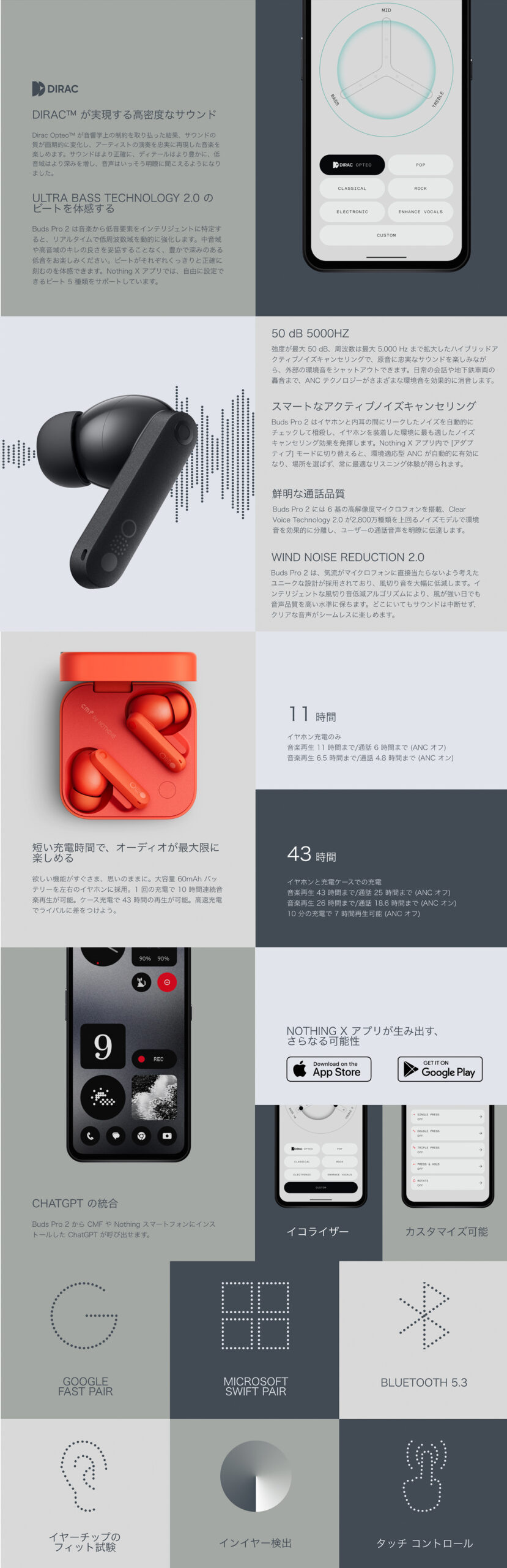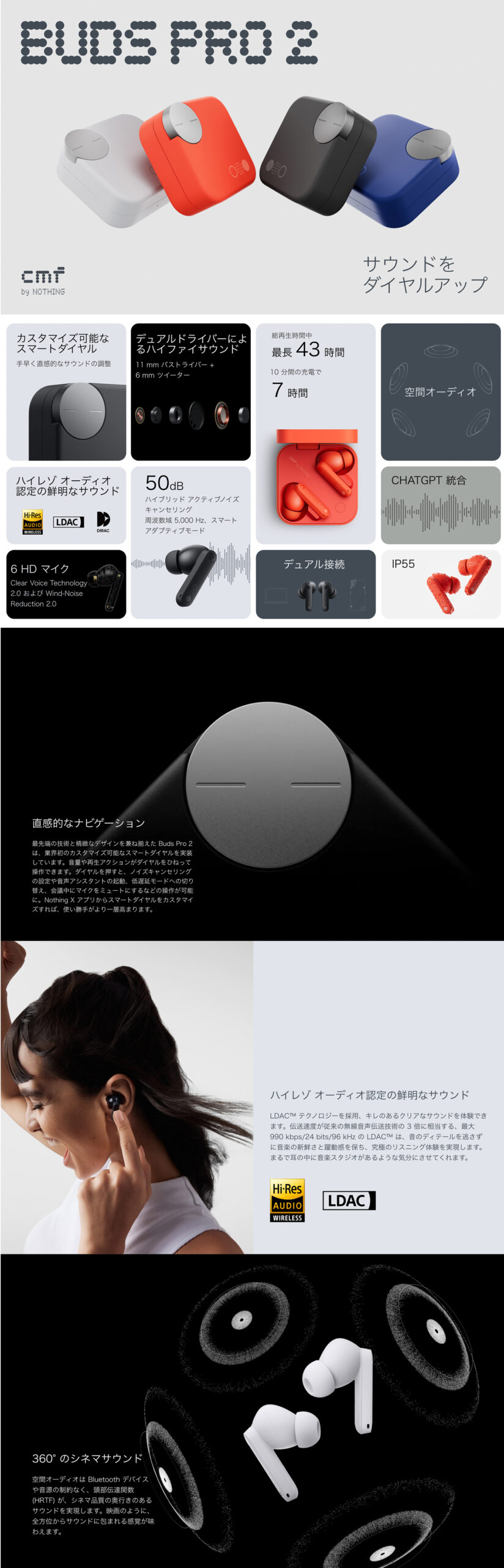 最先端技術と洗練されたデザインを融合させたBuds Pro 2は、業界初のカスタマイズ可能なスマートダイヤルを搭載。ダイヤルを回すことで音量調整や再生操作ができ、押すことでノイズキャンセリングの切替、音声アシスタントの起動、低遅延モードやマイクのミュートなど多彩な操作が可能です。さらに、Nothing Xアプリから好みに合わせてダイヤルの機能を自由にカスタマイズでき、快適な使い心地を提供します。