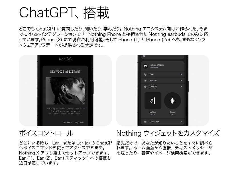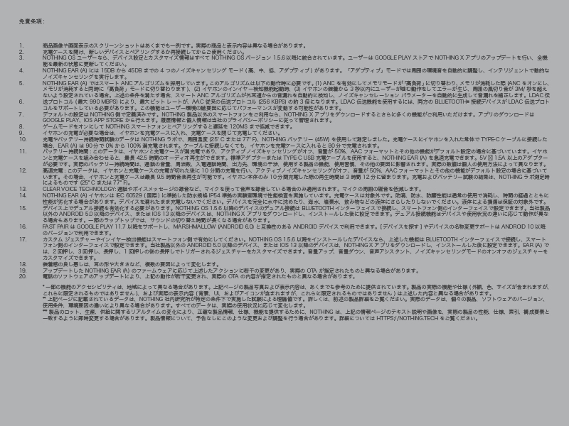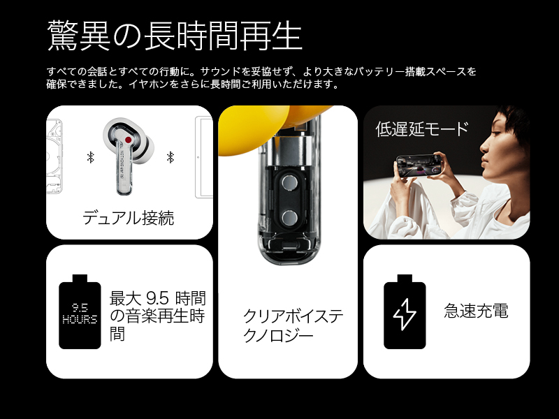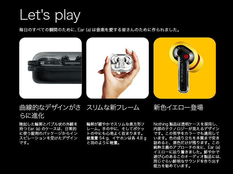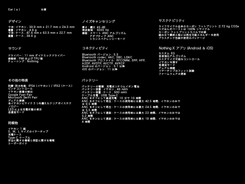 すべての会話とすべての行動に。新しいコンパクトなドライバーによって、サウンドを犠牲にすることなく、より大きなバッテリー搭載スペースを確保できました。これにより、Ear (a)をケースとともに使用すると、最大 42.5 時間の再生が可能になります。素早く起動するためには、たった 10 分間の充電で、充電ケースを使えば最大 10 時間使用できます。【NOTHINGサポートセンター】 電話:0120-789-83