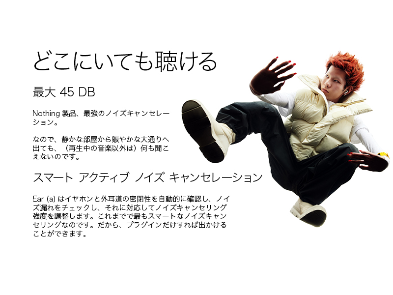 最大45dBのノイズキャンセリングにより、現実逃避感が一段と向上。これまでで最も強力なノイズキャンセリングが、サウンドにさらに没入できる体験を提供します。Ear (2)と比べて13%向上した45dBのノイズキャンセリングにより、最大1.8倍のノイズ除去効果を実現。外部ノイズの大きさだけでなく、ノイズの種類にも対応できるようになりました。最大5000Hzの帯域幅をカバーし、耳障りな音を効果的に検知・低減します。