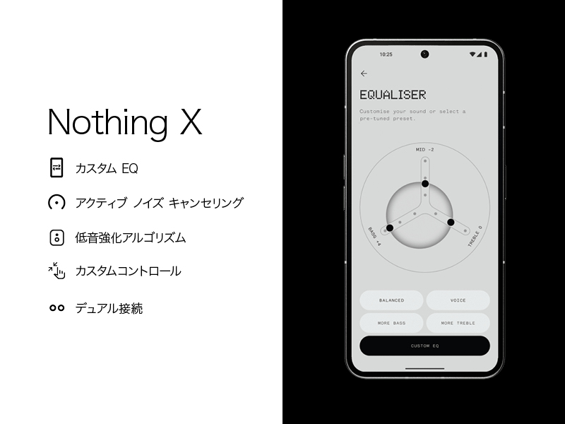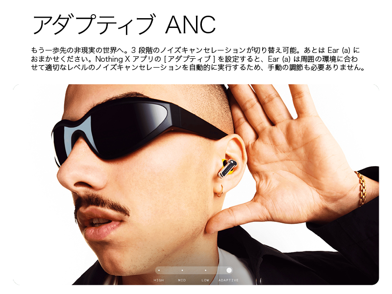 Ear (2)に搭載されていたアダプティブANCと比較し、Ear (a)では特定のシーンに最適化されたノイズキャンセリングを実現。Nothing Xアプリで「アダプティブ」モードを選ぶことで、Ear (a)が周囲のノイズに応じて、ノイズキャンセリングレベル(高、中、低)を自動的に調整します。周囲の気が散る音を検知し、ユーザーは何も操作する必要はありません。