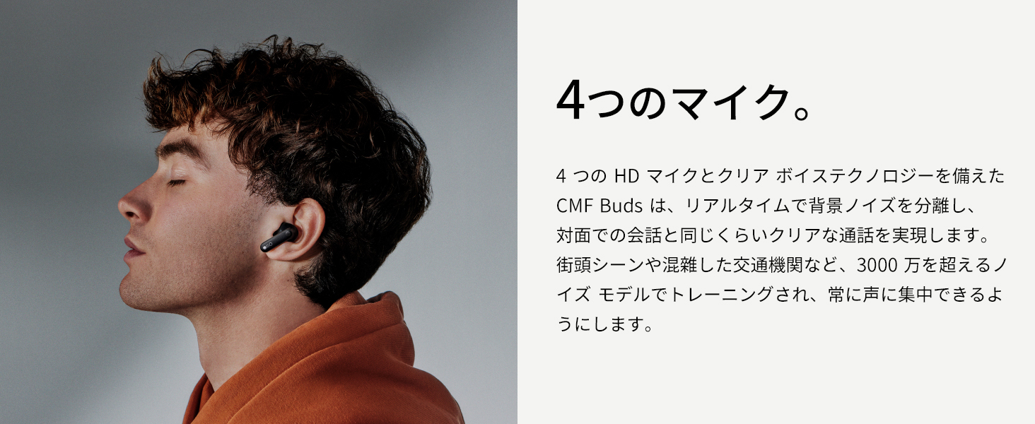 4つのHD マイクとクリア ボイス テクノロジーを備えた CMF BUDS は、リアルタイムで背景ノイズを分離し、対面での会話と同じくらいクリアな通話を実現します。街角や混雜した交通機関など、3000 万を超えるノイズ モデルでトレーニングされ、常に声に集中できるようにします。