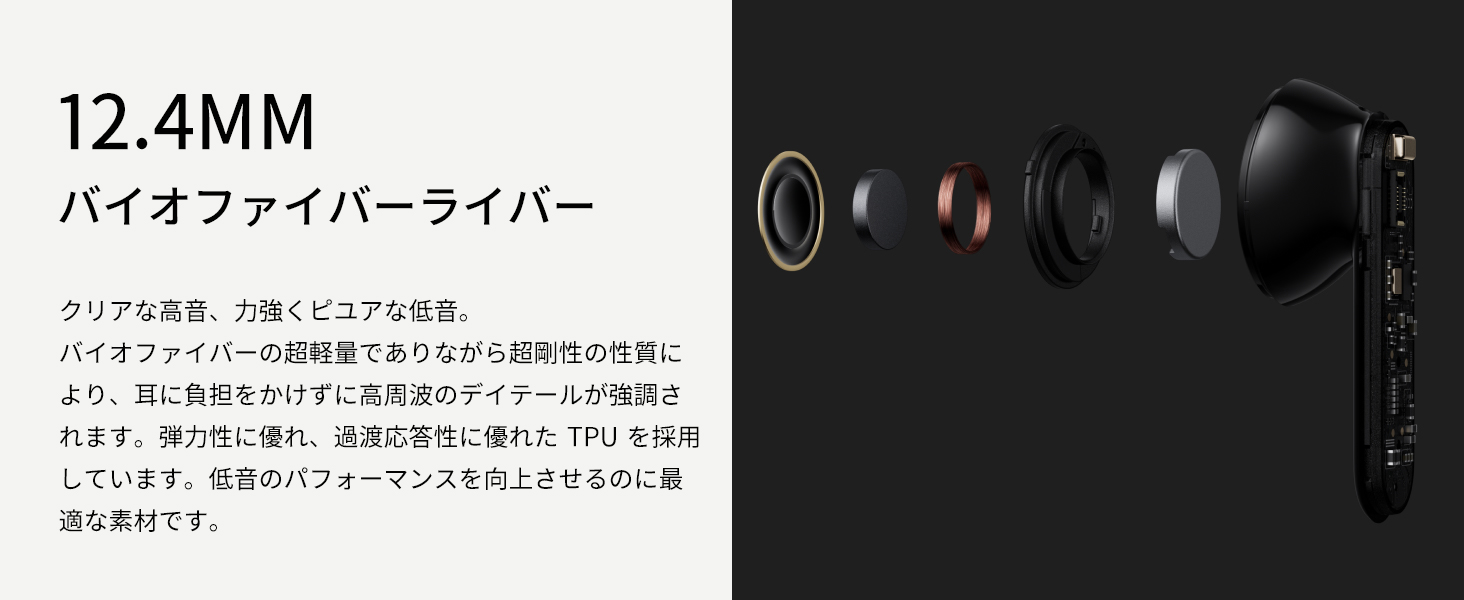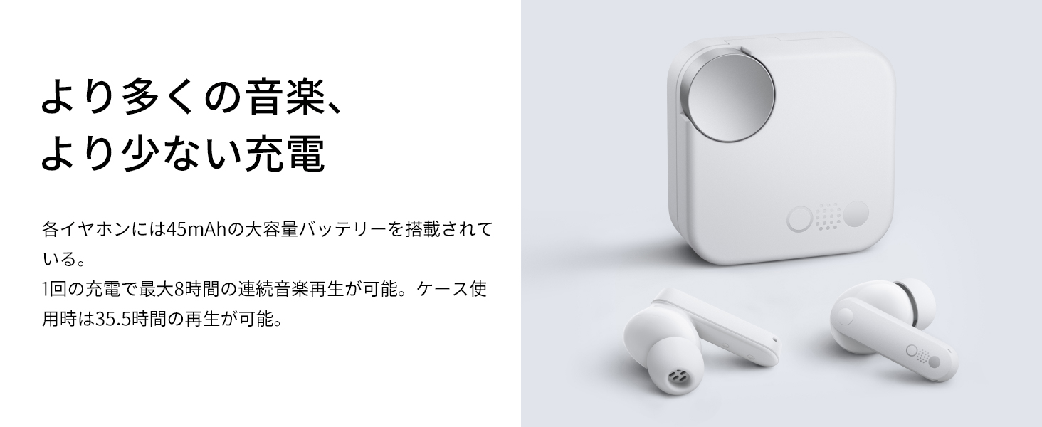 イヤホン本体には45 mAhの大容量バッテリーが搭載されています。1回の充電で最大8時間の連続音楽再生が可能。ケースと併用では35.5時間の再生が可能。