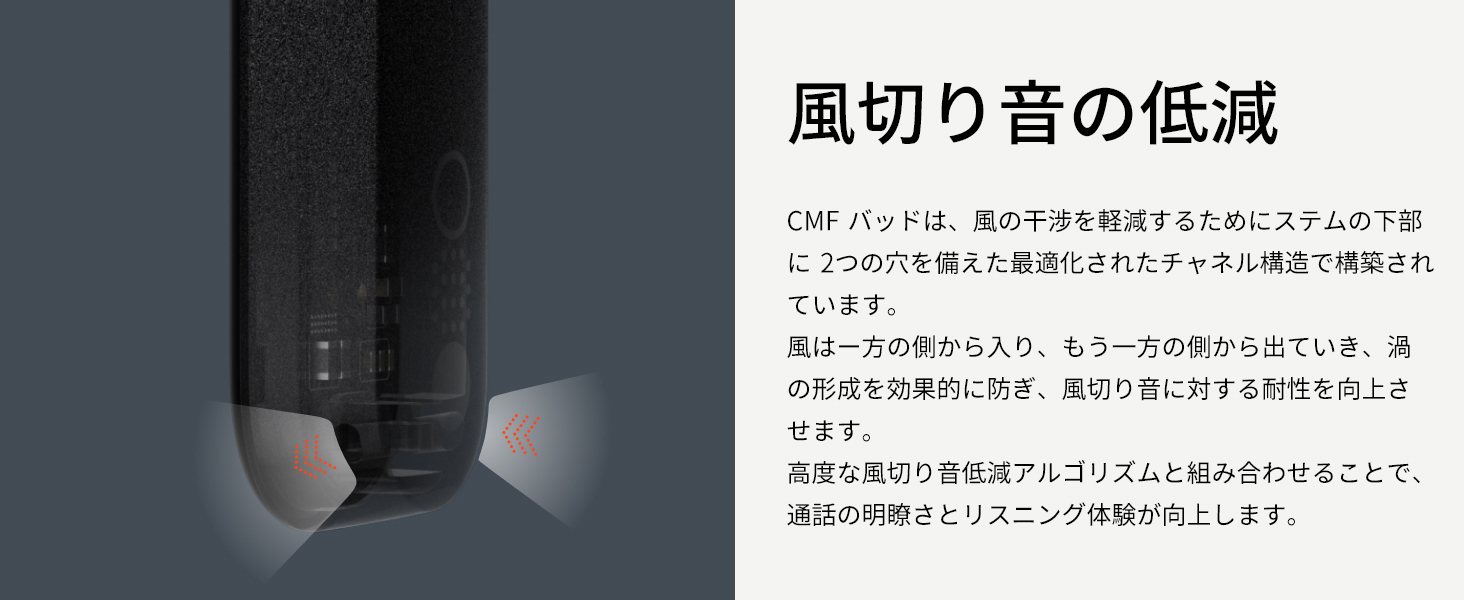 CMF BUDSは、42 dBのノイズキャンセリング機能と最大2900 Hzの音域で、ノイズをブロックします。外部のHDマイクが周囲の騒音を検知し、内部のプロセッサーがそれを消すための逆位相音波を生成し、スピーカーから放出します。なお、外音取り込みモードもサポートしています。