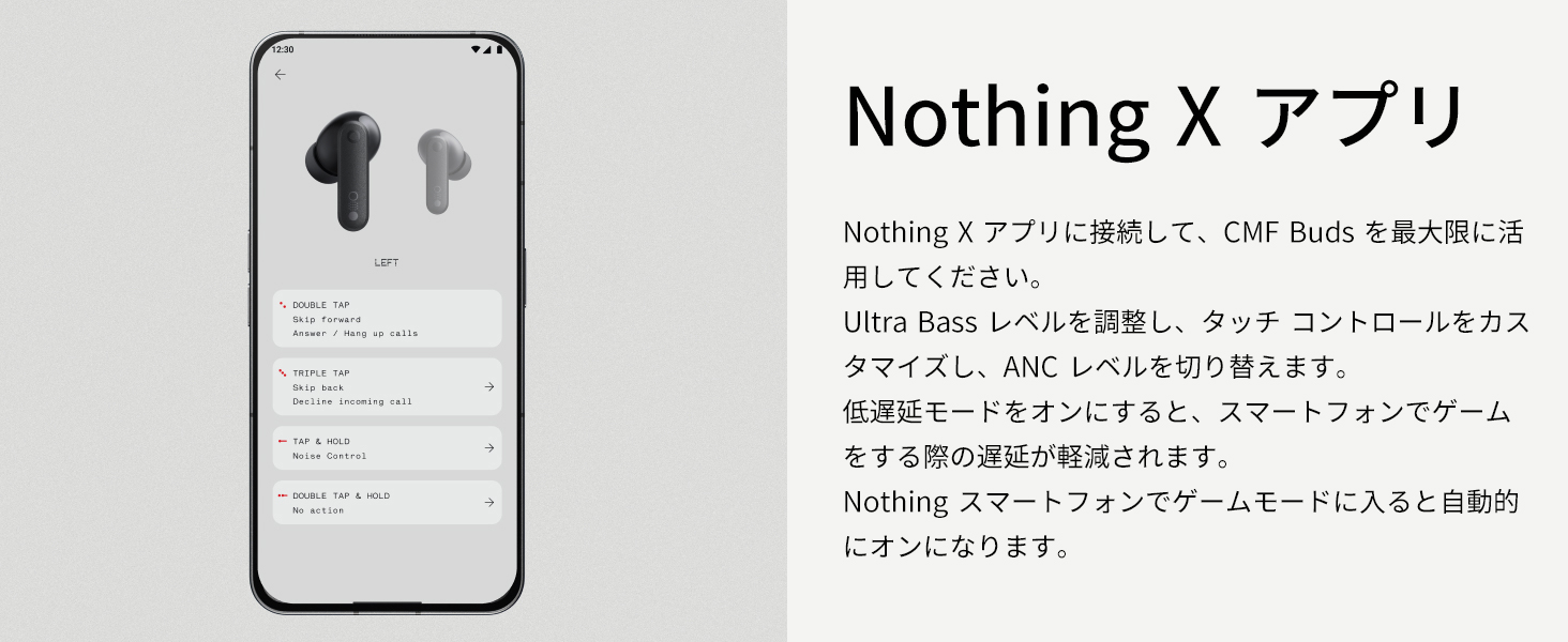 Nothing X アプリに接続して、CMF BUDS を最大限にお楽しみください。Ultra Bass レベルを調整したり、タッチ コントロールをカスタマイズしたり、ANC レベルも切り替え可能です。低遅延モードをオンにすると、スマートフォンでゲームをする際の遅延が軽減されます。Nothing スマートフォンでゲームモードに入ると自動的にオンになります。
