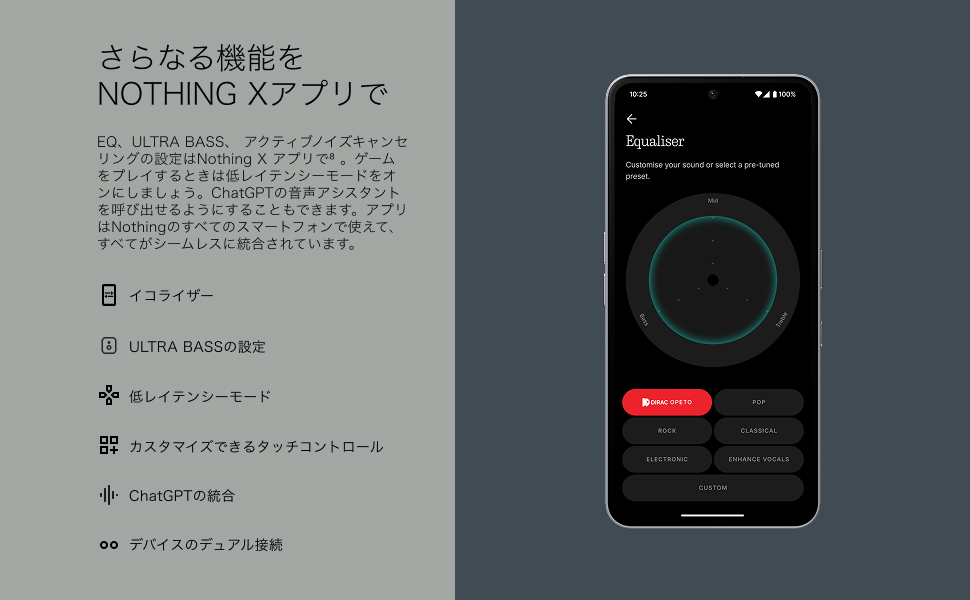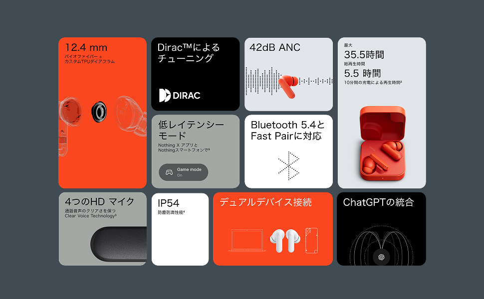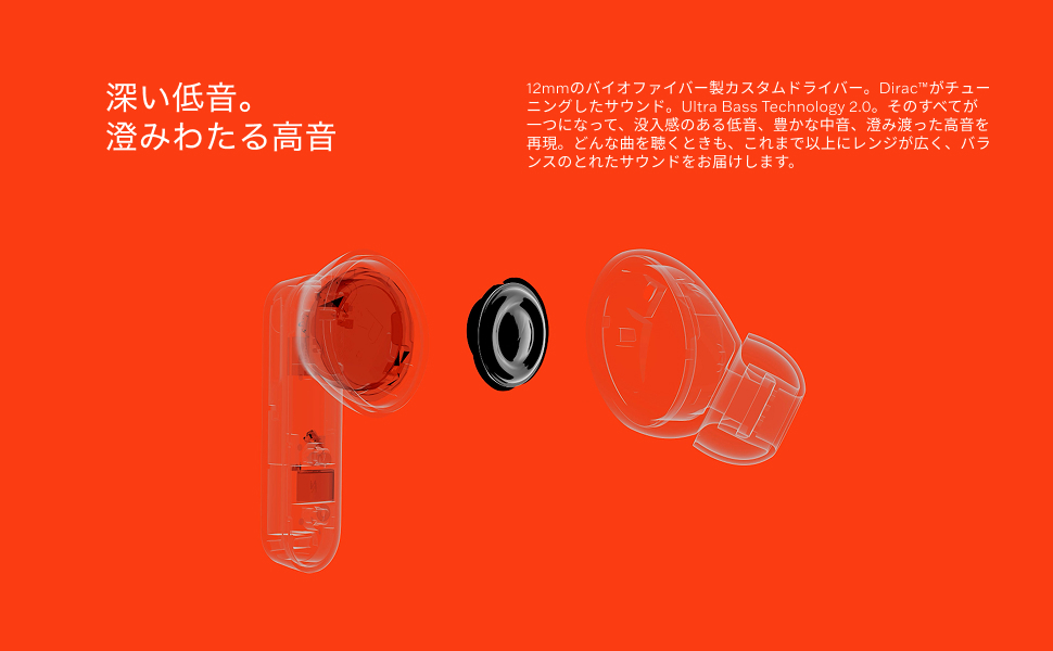 CMF Buds 2aは、12.4mmのバイオファイバードライバーとUltra Bass Technology 2.0を搭載したBluetoothワイヤレスイヤホンです。Diracによるプロフェッショナルな音響チューニングにより、迫力のある低音、豊かな中音、そして透明感のある高音を実現。あらゆるジャンルの音楽を、広がりとバランスの取れた高音質で楽しめます。
