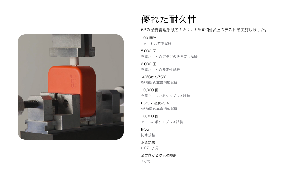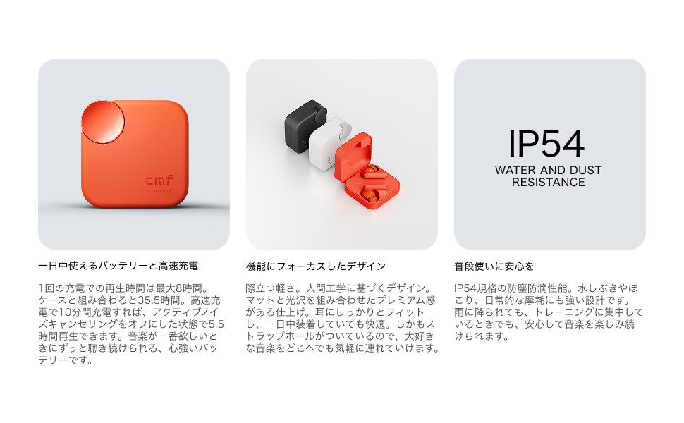 イヤホン本体はIP54準拠の防塵・防滴設計。汗や小雨、ちりにも強く、ジムや屋外での使用にも最適です。日常のさまざまなシーンで、安心して音楽を楽しめる設計です。