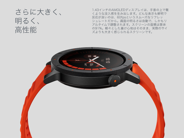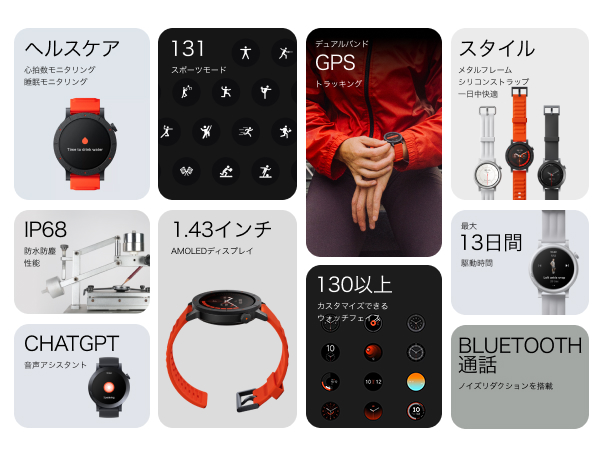 - 【120種類の文字盤+AIフェイス生成|おしゃれに自由カスタム】 120種類の動く文字盤に加え、AIがスタイルや気分に合わせて自動でフェイスを提案。お気に入りの写真や動画も文字盤に設定可能。1.43インチAMOLED画面で明るく見やすく、ビジネスもスポーツもスタイリッシュに。